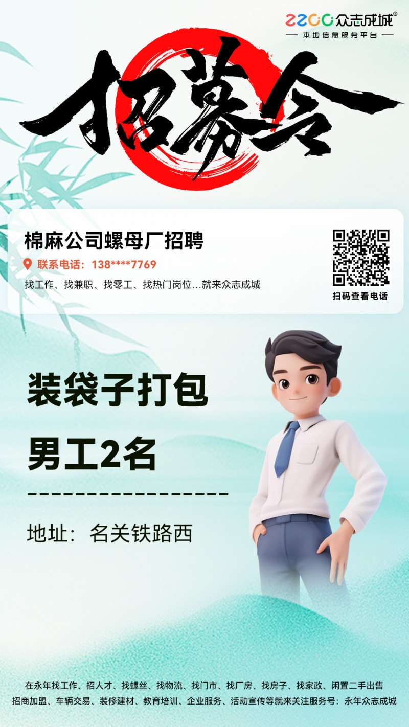邯郸市永年区城成紧固件有限公司 招聘: 1、看螺母冷镦机小工学徒2名 2、女工1名 工作地址:永年临名关镇铁路西娄山路口附近