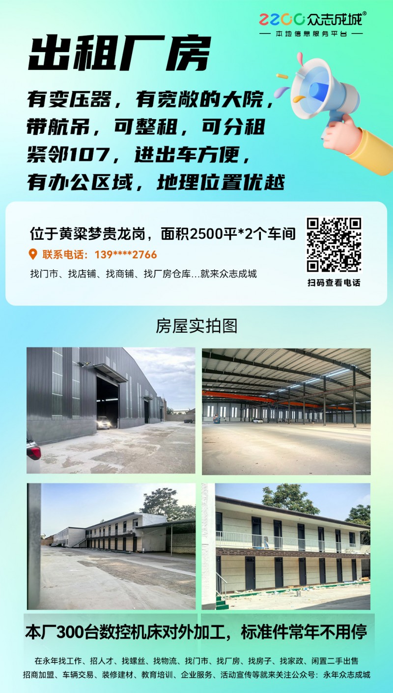 出租厂房:面积2500平*2个车间 本厂300台数控机床对外加工,标准件常年不用停位于黄粱梦贵龙岗路口 有变压器,有宽敞的大院,带