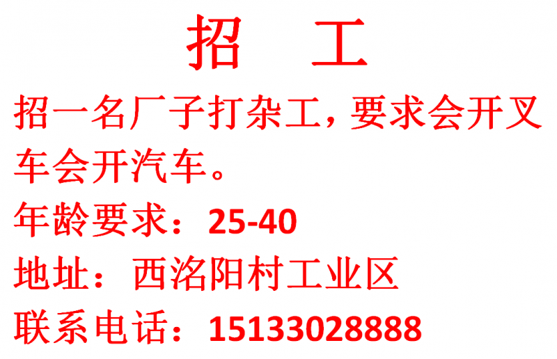 招标准件厂子打杂工要求会开叉车会开汽车。年龄25-40工作地址:西洺阳村工业区