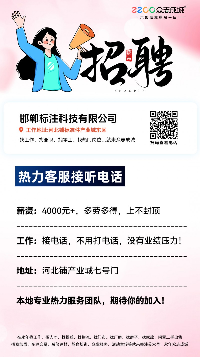 有意者可致电,或直接前往河北铺产业城七号门邯郸标注科技有限公司人事部面试。