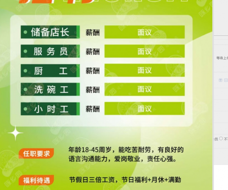 招聘:服务员任职要求:年龄18-45周岁,能吃苦耐劳,有良好的语言沟通能力,爱岗敬业,责任心强。福利待遇:节假日三倍工资,节
