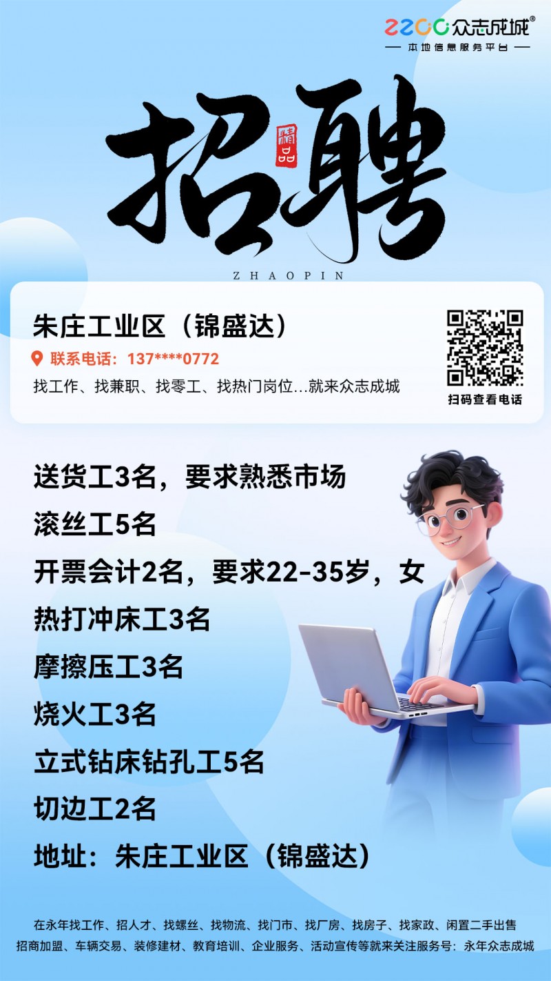 招工 热打冲床工3名 摩擦压工3名 烧火工3名 立式钻床钻孔工5名 地址:朱庄工业区,锦盛达园区