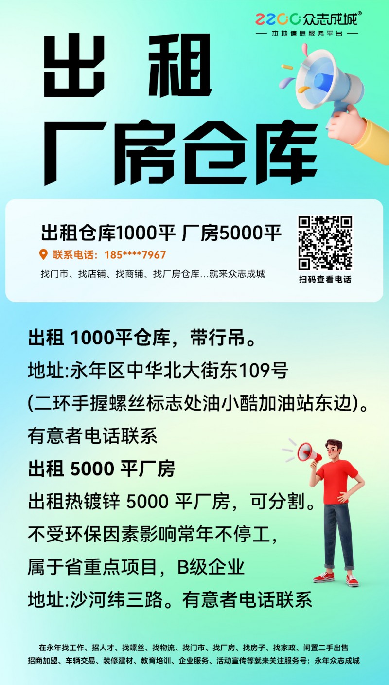 诚意出租仓库1000平米,带行吊。地址:永年中华大街二环(手握螺丝标志处,油小酷加油站东边),有意者电话联系。