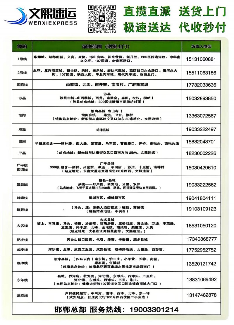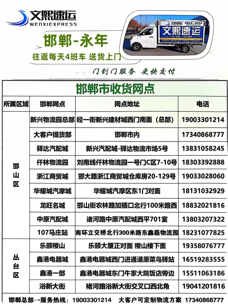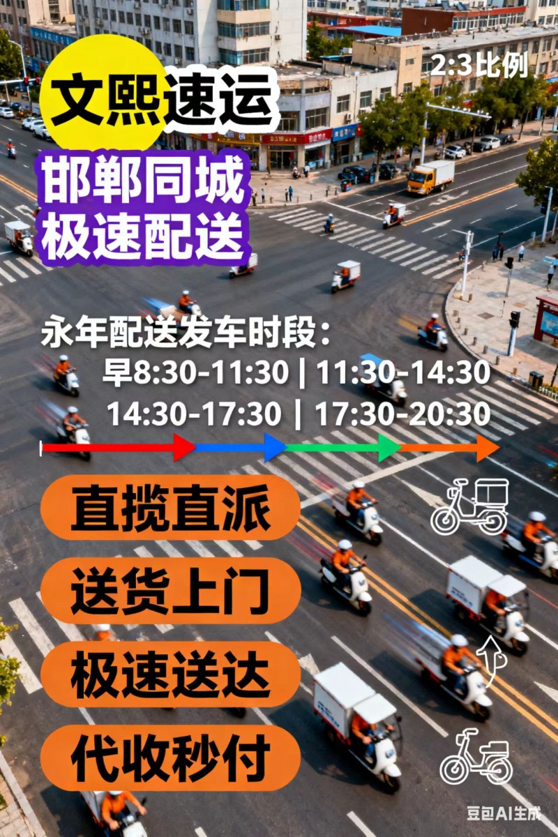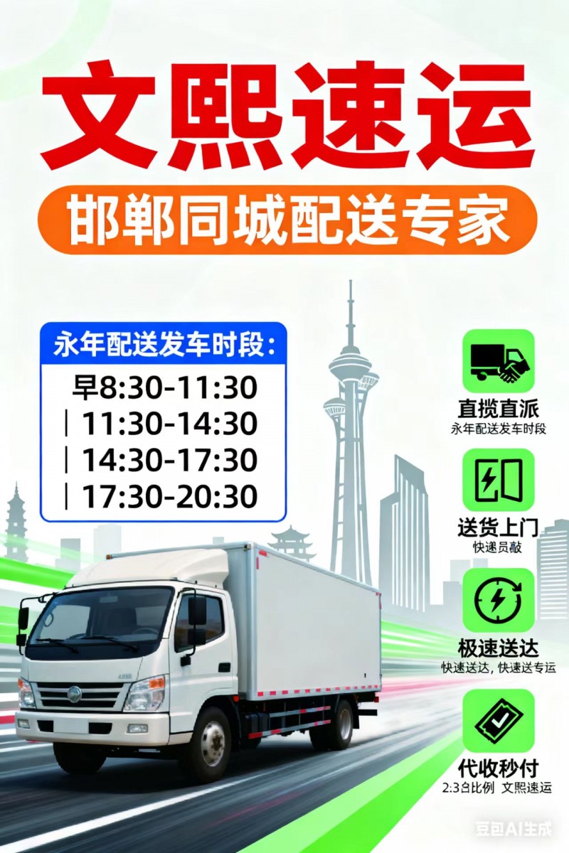 文熙速运·邯郸同城急送强势入驻永年!!! 直揽直派 | 送货上门 | 极速送达 | 代收秒付 同城急件不用慌,文熙速运来帮忙! 邯郸全城配送,紧固件、文件、礼品、生鲜全品类覆盖,上午下单下午达,直达客户手中,全程实时追踪,时效快过期待,让距离不再耽误事~ ⏰ 永年配送发车时段: 早8:30-11:30 | 11:30-14:30 | 14:30-17:30 | 17:30-20:30 ✅ 配送时效超3小时免单!支持上门提货 诚招永年乡镇合作商 地址永年站地址是107国道洺州加油站南行100米(老农大路口路东)
