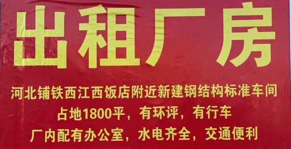 出租厂房2500平.2500平.2500平有办公室,有宿舍。厂房环境优越,有行车,带5吨航吊,水电齐全,适合标准件行业,有环评,紧邻107