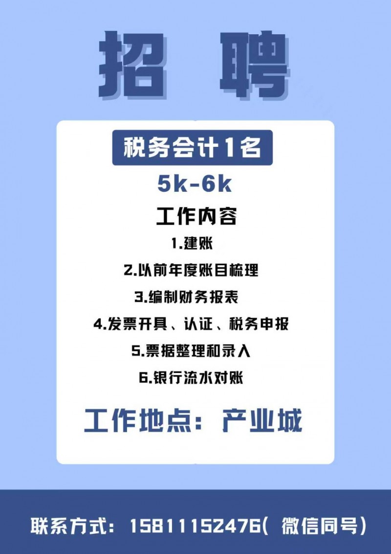 建材类商贸公司招税务会计1名 工资:5000-6000/月每周休1天 工作地点:产业城