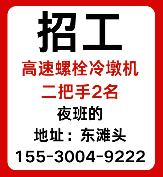招工 高速螺栓冷墩机二把手2名 夜班的 地址:东滩头