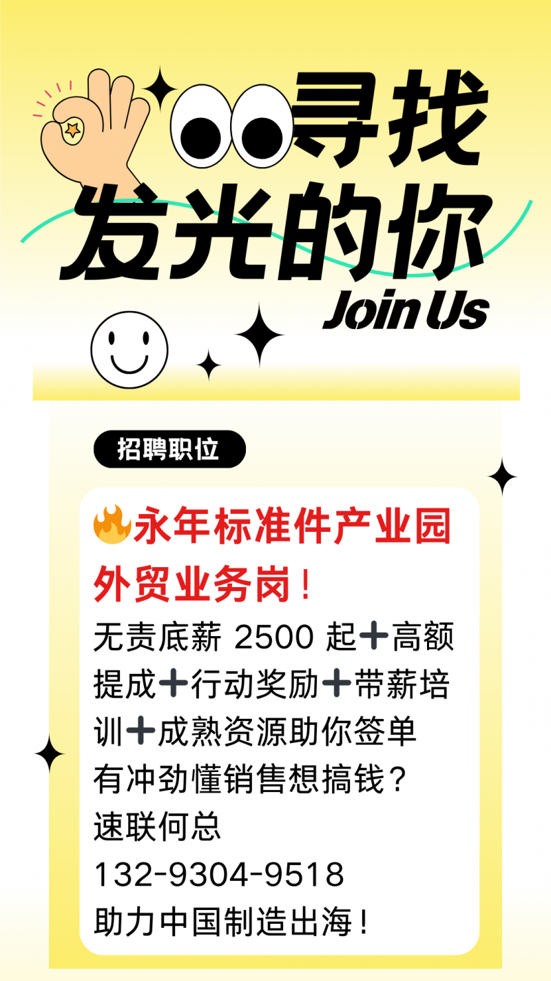 急聘 永年标准件产业园外贸业务岗! 无责底薪 2500 起➕高额提成➕行动奖励➕带薪培训➕成熟资源助你签单,有冲劲懂销售想搞钱? 助力中国制造出海!