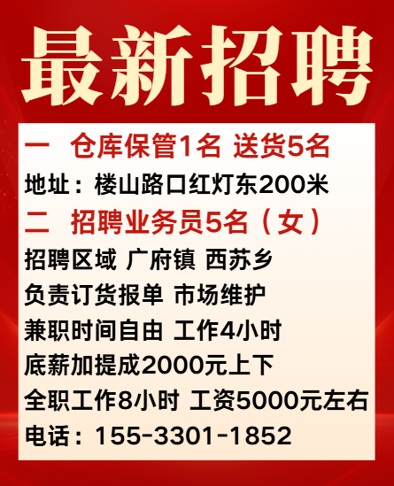 招聘 仓库保管1名 地址:楼山路口红灯东200米。