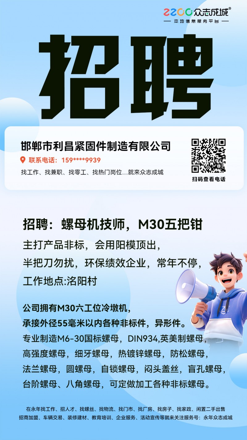 招聘职位:普工/技工 螺母机技师