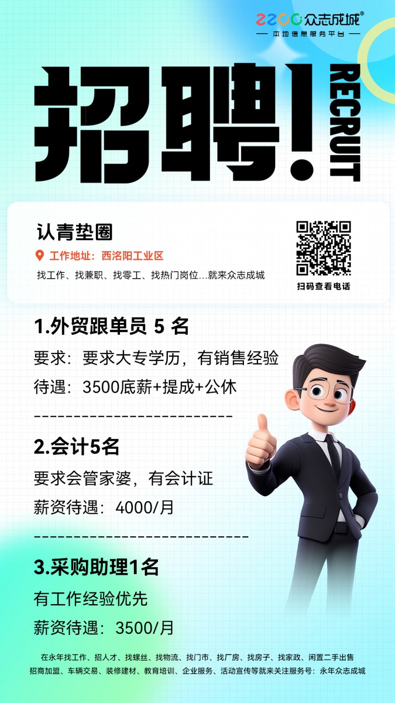 招聘:外贸跟单员 5 名任职要求:要求大专学历,有销售经验工资待遇:3500,底薪+提成+公休。地址:西洺阳工业区