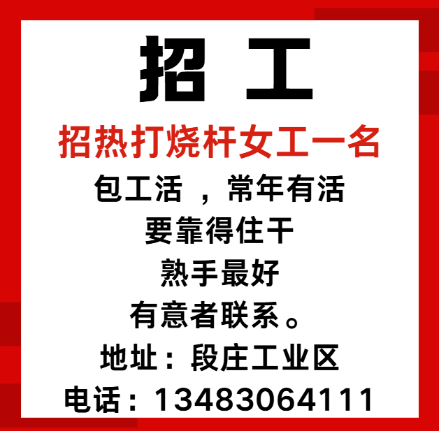 本厂招:热打烧杆女工一名 包工活 ,常年有活,要靠得住干 熟手最好,有意者联系 地址:段庄工业区