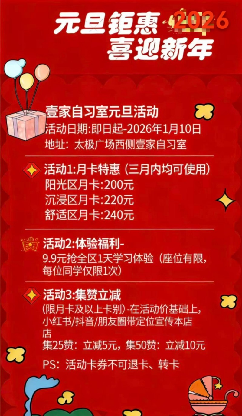 大极广场壹家自习室,优惠活动中,抓紧抢购中,有效时间三个月欢迎电话联系
