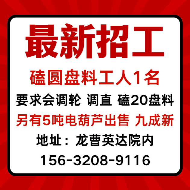 招工 磕圆盘料工人1名 要求会调轮 调直 磕20盘料 地址:龙曹英达院内