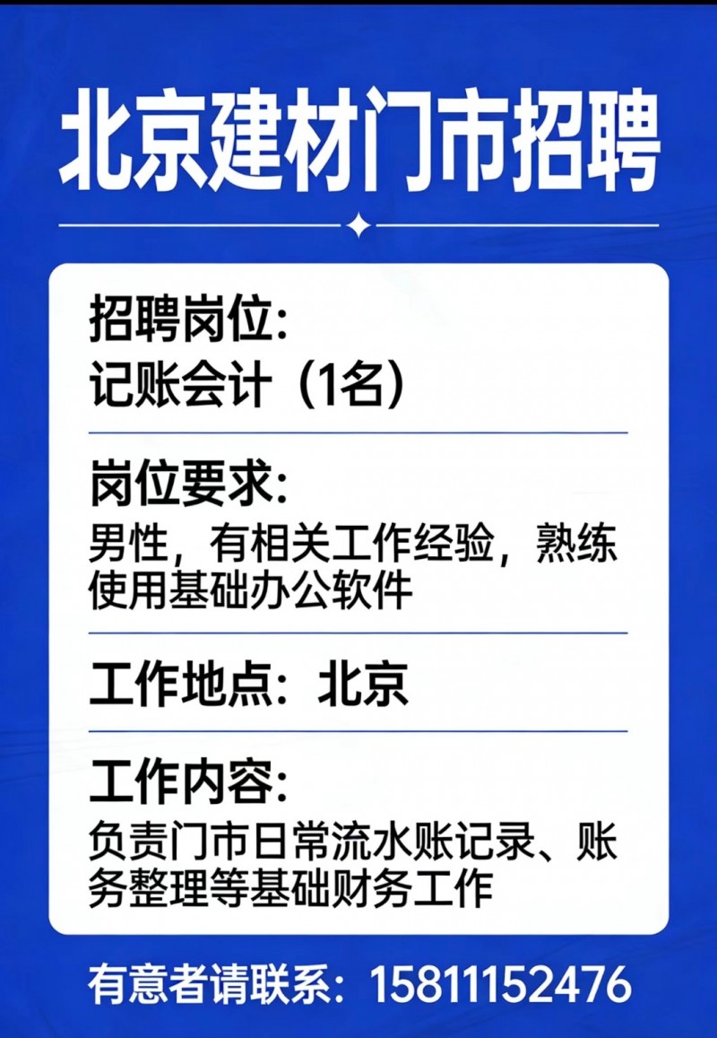 岗位要求:男性,有相关工作经验,熟练使用基础办公软件
