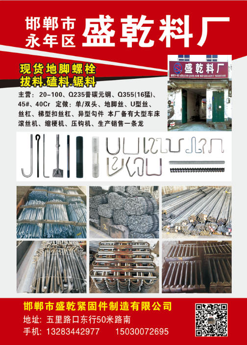 邯郸市永年区盛乾料厂 现货.地脚.螺栓.拔料.磕料.锯料 主营:20-100、Q235普碳元钢、Q355(16猛)45#、40Cr 定做:单/双头、地脚丝、U型丝、丝杠、梯型扣丝杠、异型勾件本厂备有大型车床,滚丝机、缩梗机、压钩机、生产销售一条龙