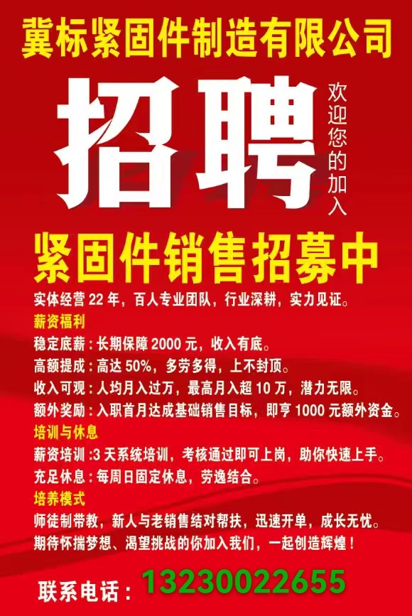 螺丝销售人员2人,年龄25-40岁男女不限,保底:2000元公休4天团建找工作联系