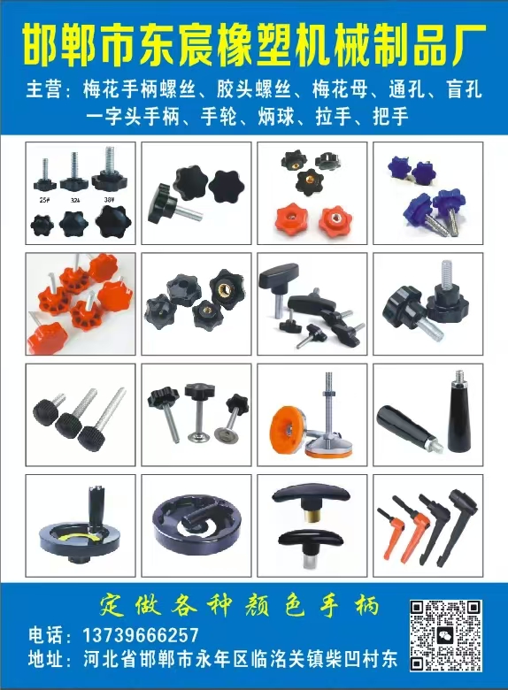 主营:梅花手柄螺丝、胶头螺丝、梅花母、通孔、盲孔一字头手柄、手轮、炳球、拉手、把手