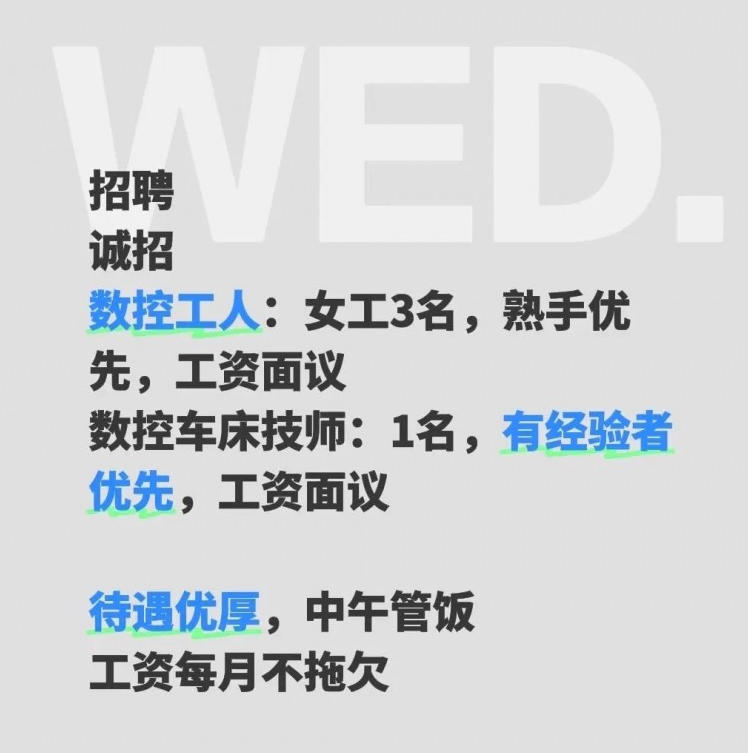 1、数控女工3名; 2、数控车床技师1名; 有经验者优先,工资面议待遇优厚; 中午管饭工资每月不拖欠