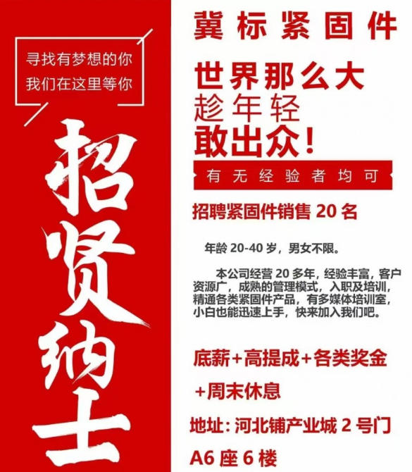 招聘紧固件销售20名