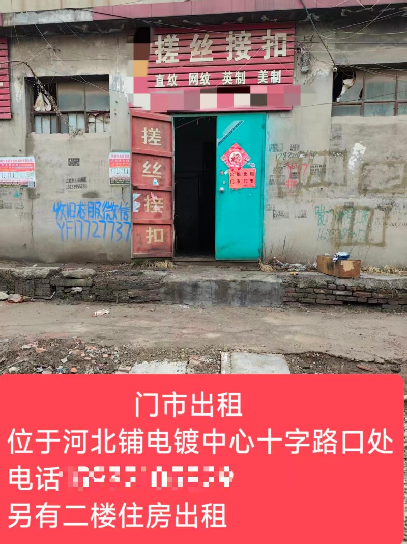 门市出租,位于河北铺村村南电镀中心十字路口处。门市里带套间,地理位置优越,水电齐全。