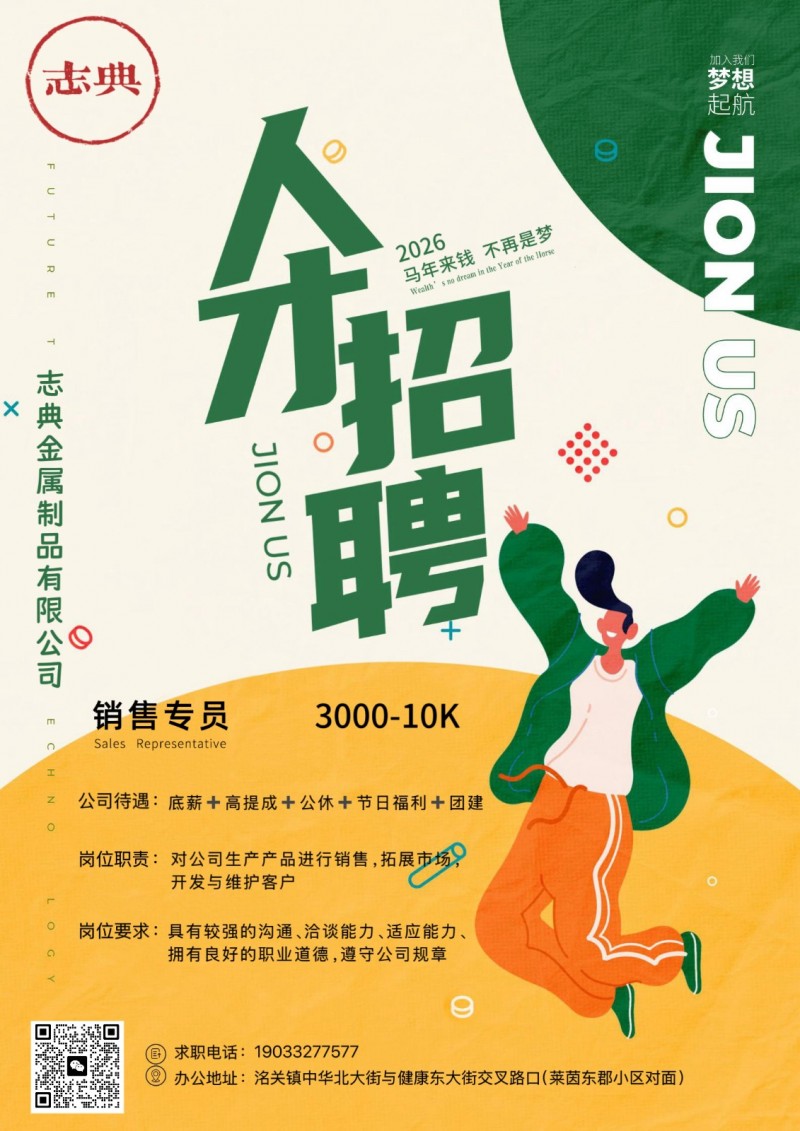 招聘销售薪资:底薪3000+50%提成+开单奖工时作间:9:00-5:30,7天公休。要求:年龄25岁以上,沟能通力强,能长稳期定