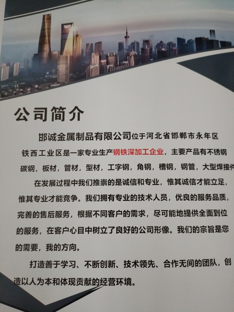 你好,我们河北邯郸永年的,主要经营不锈钢碳钢,板材,管材,型材,工字钢,角钢,槽钢,钢管,大型焊接件的,有需要的可以联系我V1313-1029-937