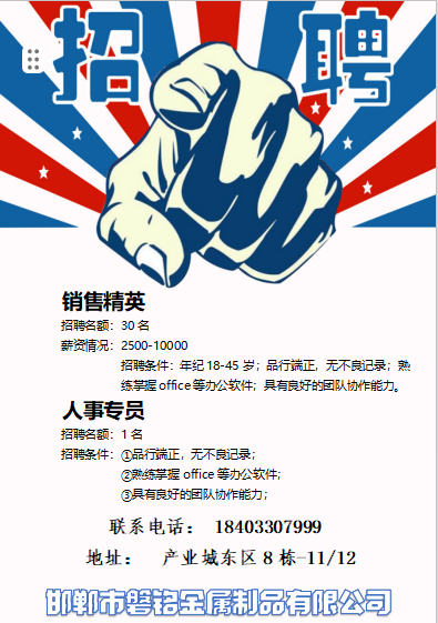 招聘:销售 诚聘:销售精英薪资福利:常年底薪+高额提成+周数据奖励+工龄奖,每月月初开支,薪资从不空谈,周日固定休息。任职要求:年龄23