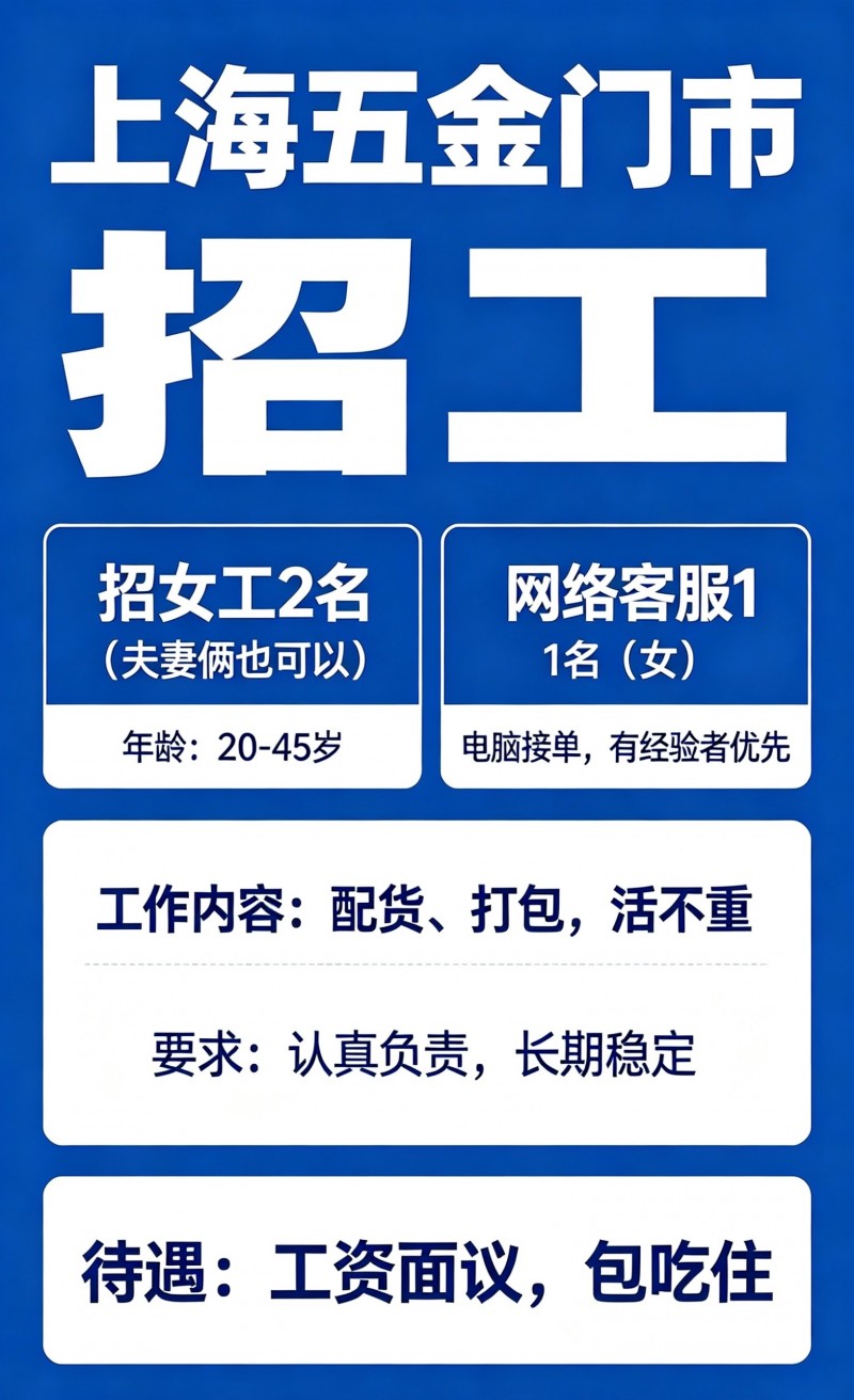 上海五金门市招工 招女工 2名 (夫妻俩也可以) 年龄:20-45岁 工作内容:配货、打包,活不重 要求:认真负责,长期稳定 待遇: