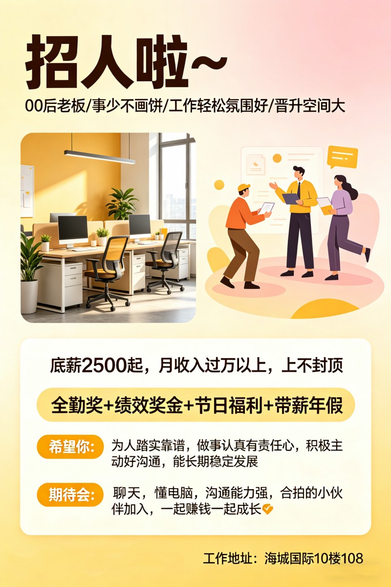 招人啦~人事 底薪2500起,月收入过万以上 上不封顶 全勤奖+绩效奖金+节日福利+带薪年假 00后老板,事少不画饼 工作轻松氛围好,