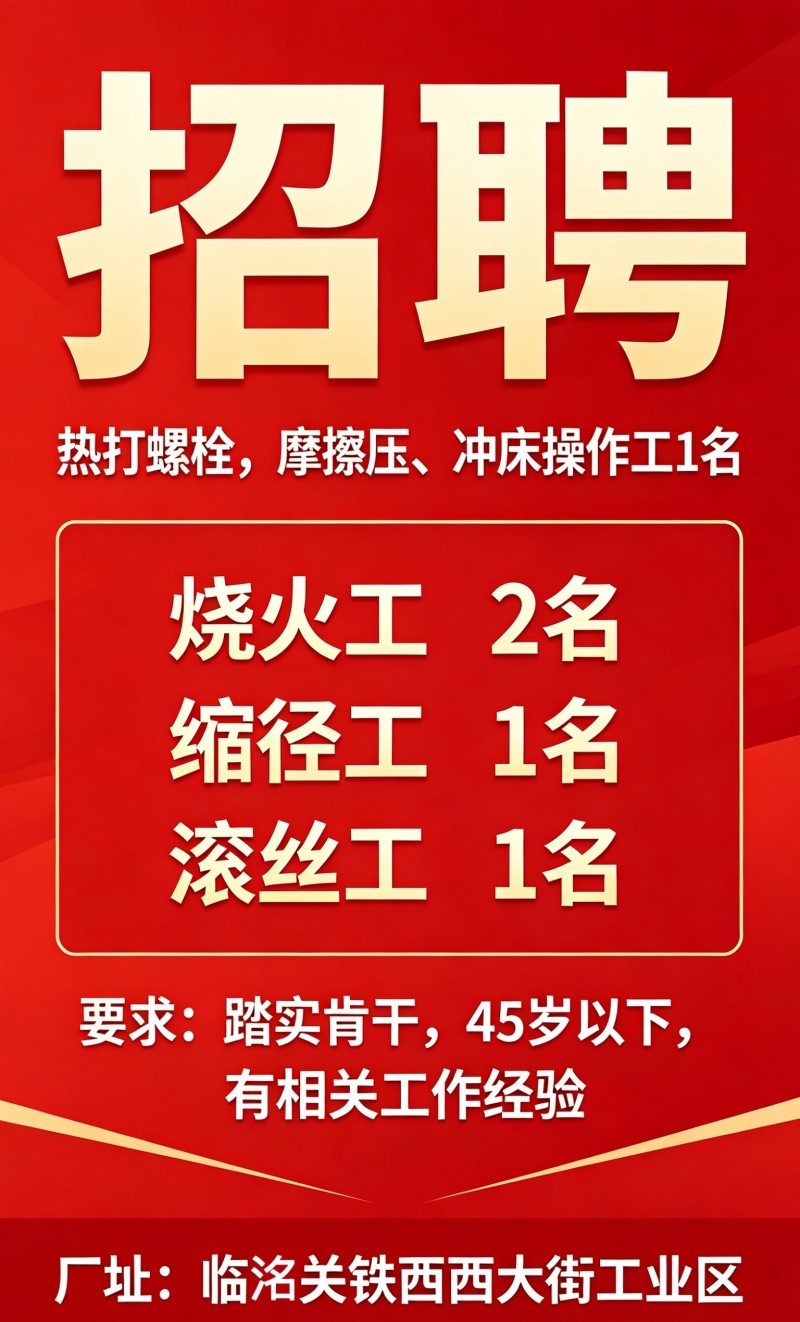 招聘职位:热打工,滚丝工,冲床工 摩擦压,缩径工,烧火工