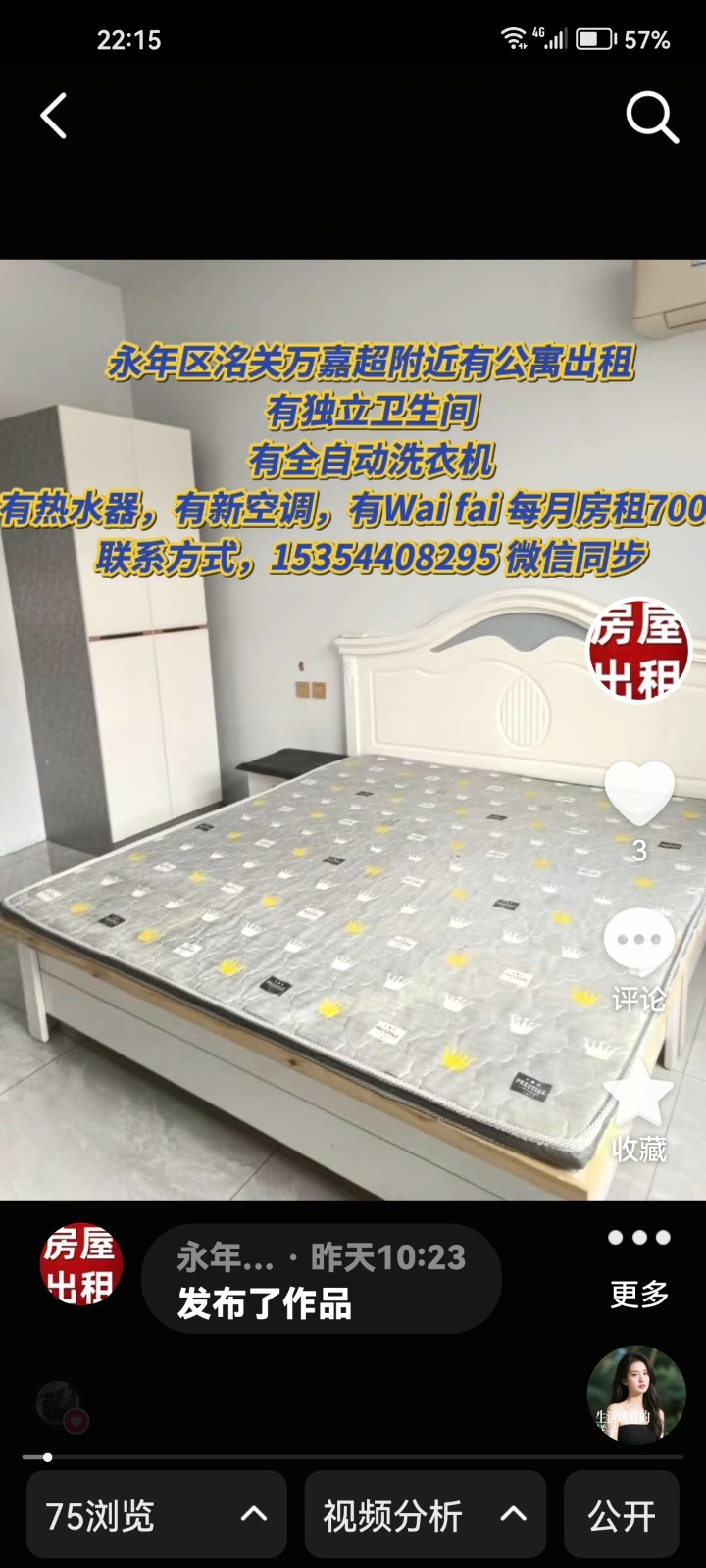 永年洺关万嘉超市附近公寓出租,有新空调,有独立卫生间,有热水器,有全自动洗衣机, 有WaiFai.院内停车方便,连系方式,。微信同号