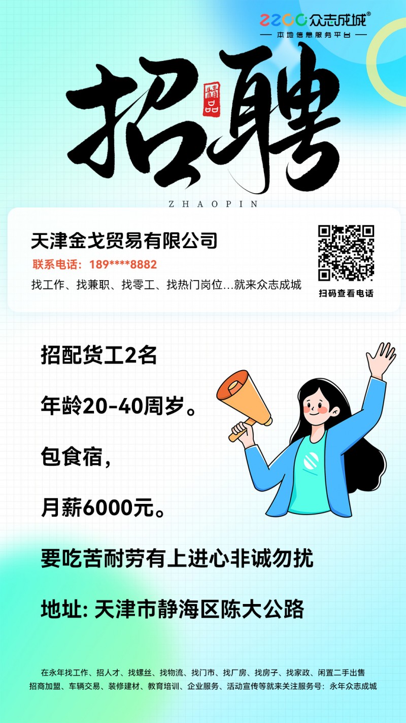 天津标准件招聘配货工2名 年龄20-40周岁。 包食宿,月薪6000元。 要求:有工作经验,吃苦耐劳有上进心,混天者勿扰。