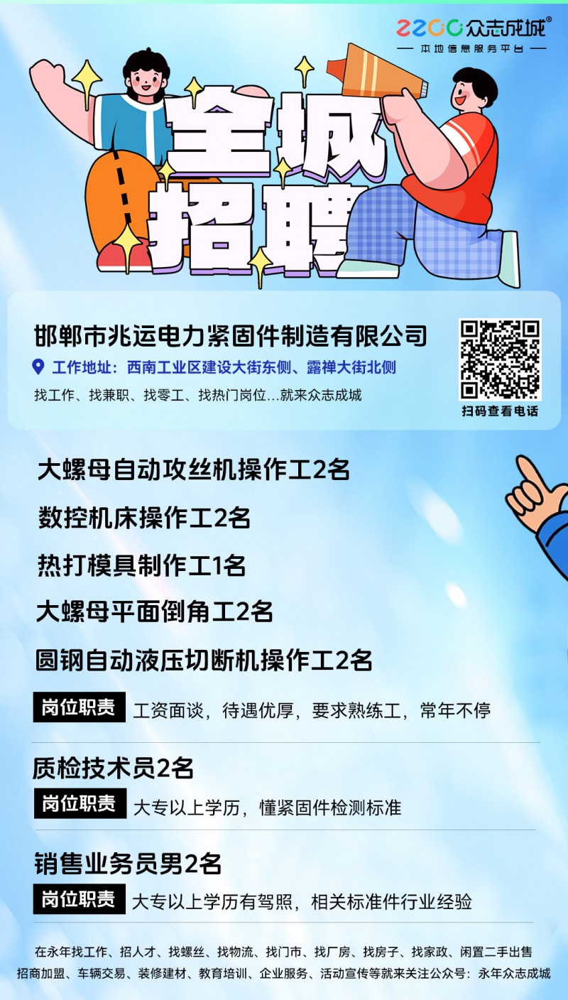 邯郸丛台区(永年飞地经济园区)招聘:1、大螺母平面倒角工2名;2、圆钢自动液压切断机操作工2名;工资面谈,待遇优厚,要求熟练