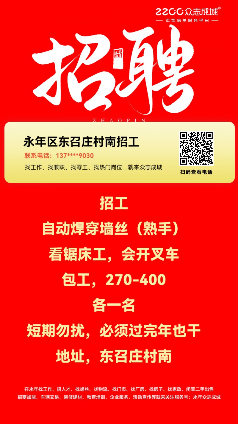 招工:看锯床工,会开叉车包工,270-400短期勿扰必须过完年也干东召庄村南