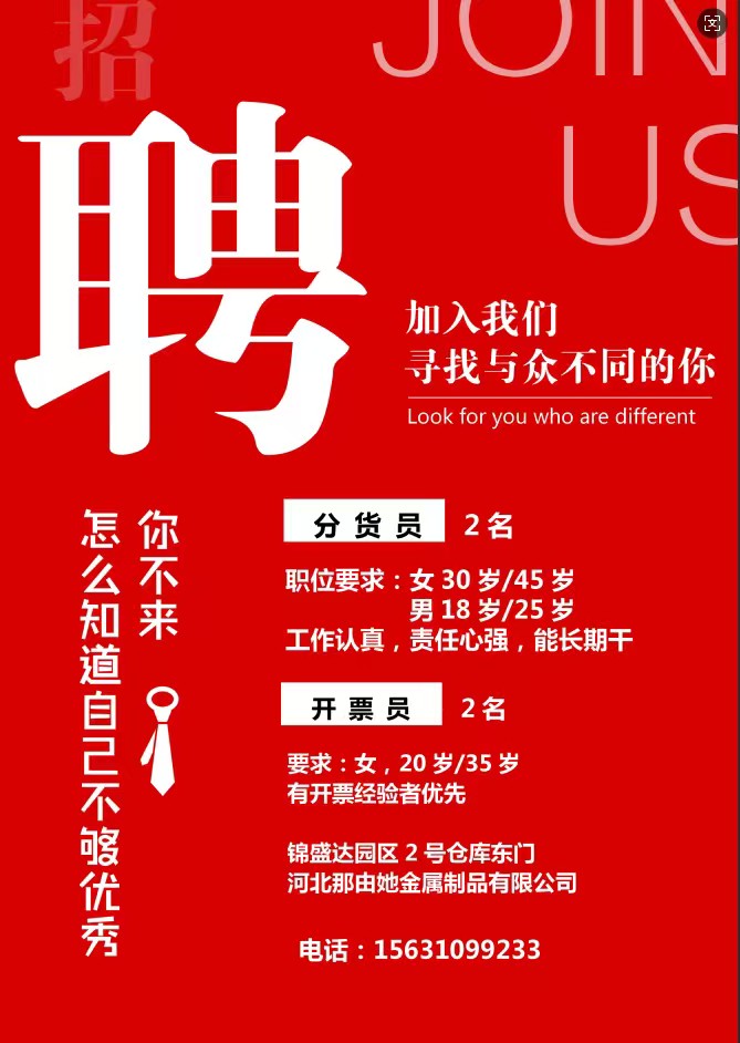 分货员2名 职位要求:女30岁/45岁男18岁/25岁工作认真,责任心强,能长期干 开票员2名 要求:女,20岁/35岁有开票经验者优先 工作地点:锦盛达园区2号仓库东门 招聘单位:河北那由她金属制品有限公司
