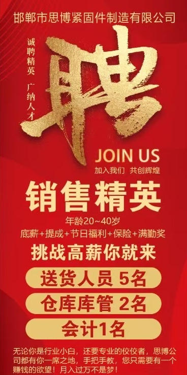 招聘:销售,客服 销售客服2-3人底薪3000-不封顶 福利待遇:高奖金、公休、团建、全勤、每周单休节日福利公司主营:机械锚栓销钉销片,实力工厂自产