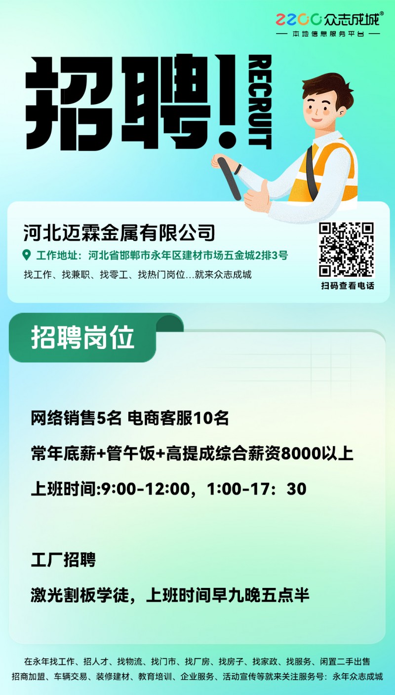 招聘 【电商客服】15名待遇常年底薪管午饭高提成上班时间:9:00-12:00,1:00-17:30公休四天,节假日休息公司地址:永年区建材市