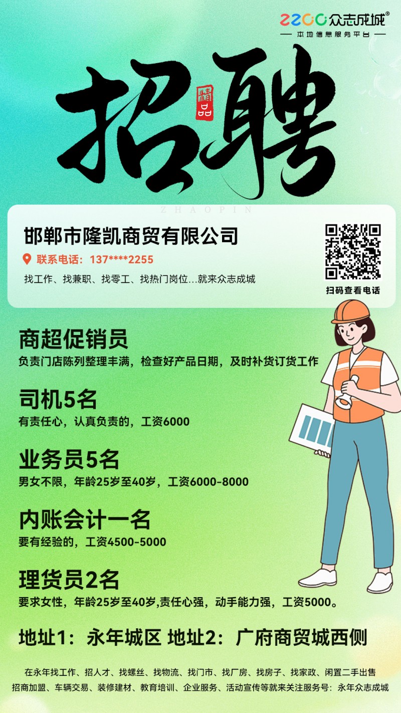 隆凯商贸有限公司招聘:业务员5名 男女不限,年龄25岁至40岁,工资6000-8000地址1:永年城区地址2:广府商贸城西侧