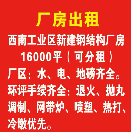 厂区:水、电、地磅齐全。环评手续齐全:退火、抛丸调制、网带炉、喷塑、热打、冷墩优先。
